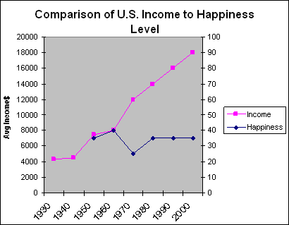 The chart below shows that even though Americans have gotten exponentially richer since the 1950s, they’ve actually become less happy.